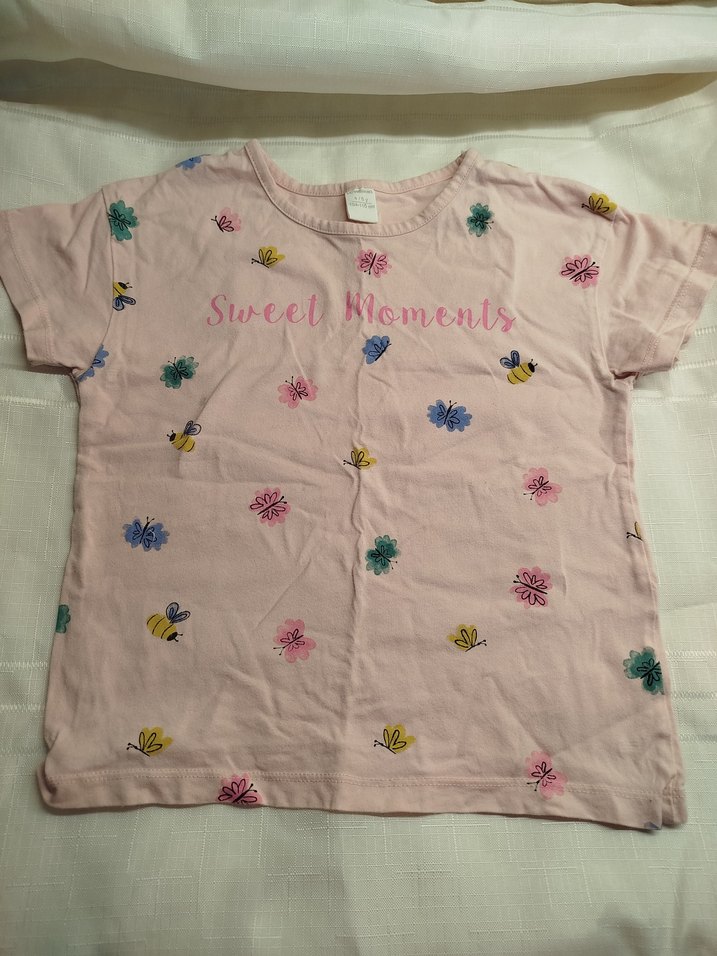 Kız çocukları için pembe, bol kesim kısa kollu tişört. Yuvarlak yakalı, pul işlemeli yazılı ve renkli kelebek-böcek baskılıdır.