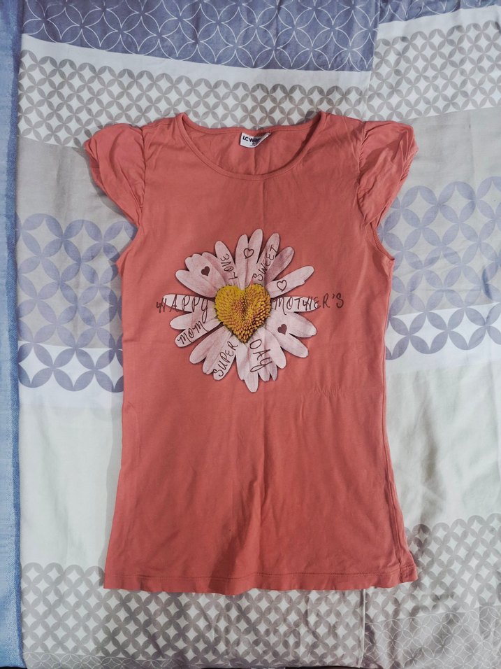 Rahat kesim, kısa kollu, pembe kız çocuk tişörtü, sarı kalp detaylı baskılı çiçek deseniyle. Yumuşak tekstil malzemeden yapılmıştır.