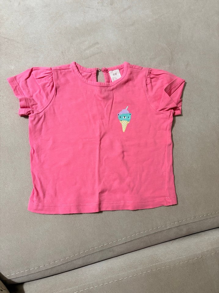 Kız çocuk tişörtü, kısa kollu ve fırfırlı detaylara sahip. Yumuşak ve sıcak kumaştan, salaş kesim ve renkli baskılı dondurma deseni bulunur.