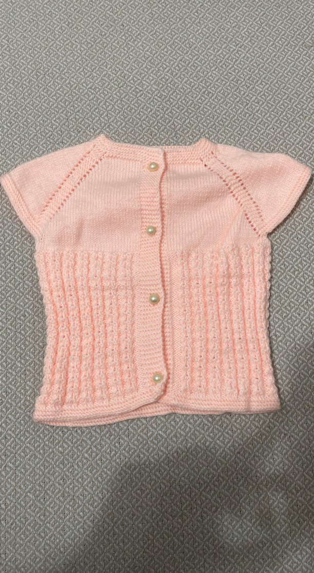Kız çocuk için pastel pembe renkte, kısa kollu, fitted kesim triko hırka. İnce örme yapıda ve inci düğmelidir. 6ay-1yaş