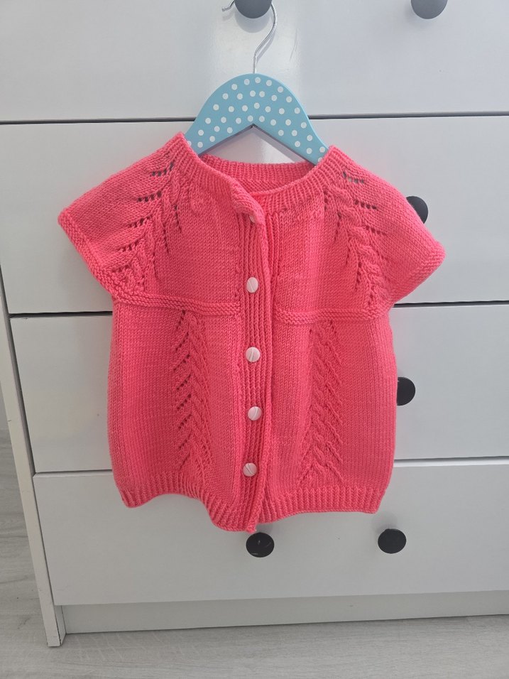 Pembe renkli, kısa kollu, yumuşak triko kumaştan örülmüş, bol kesim kız çocuk hırkası. Desensiz ve rahat kullanım için uygundur. iki kol altı 31 uzunluk 36 bebe yünü ile örülmüştür