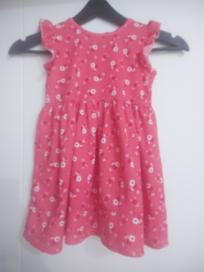 Kız çocuklar için kolsuz, V yaka ve fırfır detaylı pembe elbise. Rahat kesimli, yumuşak sentetik kumaş ve renkli çiçek desenlidir.