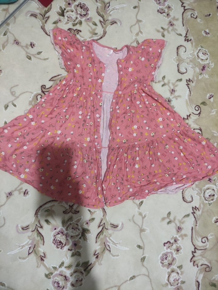 Pembe kolsuz elbise, bol kesim ve fırfır detaylarıyla V yakaya sahiptir. Yumuşak sentetik kumaştan yapılmış, pastel tonlarda batik desenli bohem tarzdadır.