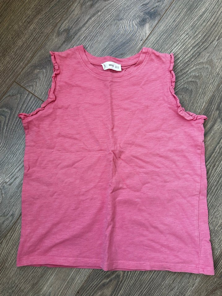 Yumuşak keten kumaştan yapılmış, pastel pembe renkli, kolsuz ve fırfırlı detaylı kız çocuk tişörtü. Rahat kesim ve yuvarlak yaka.