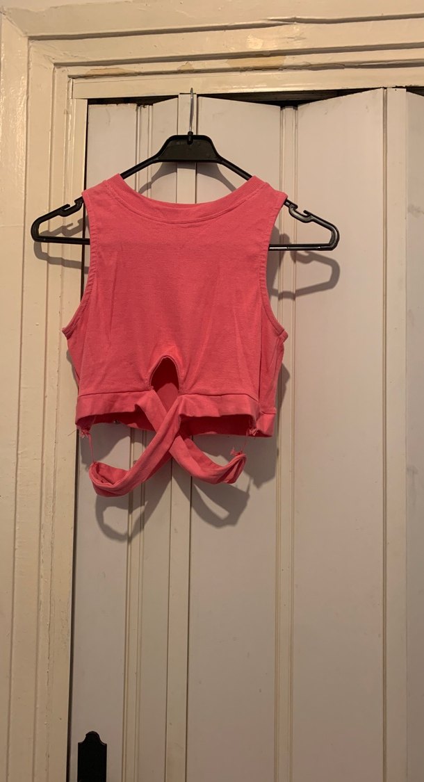 Kız çocukları için kolsuz, halter yaka ve bel detaylı pembe bluz. Yumuşak sentetik kumaştan üretilmiştir.