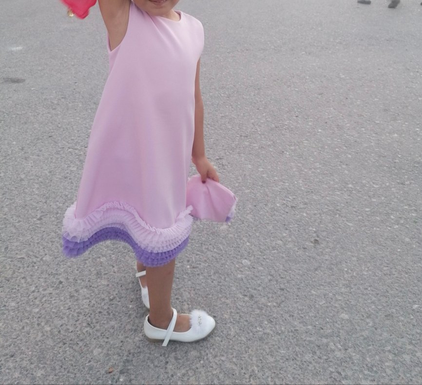Kız çocukları için pastel pembe renkte, kolsuz, yuvarlak yakalı, bol kesim elbise. Etek kısmında volan detayları bulunur.