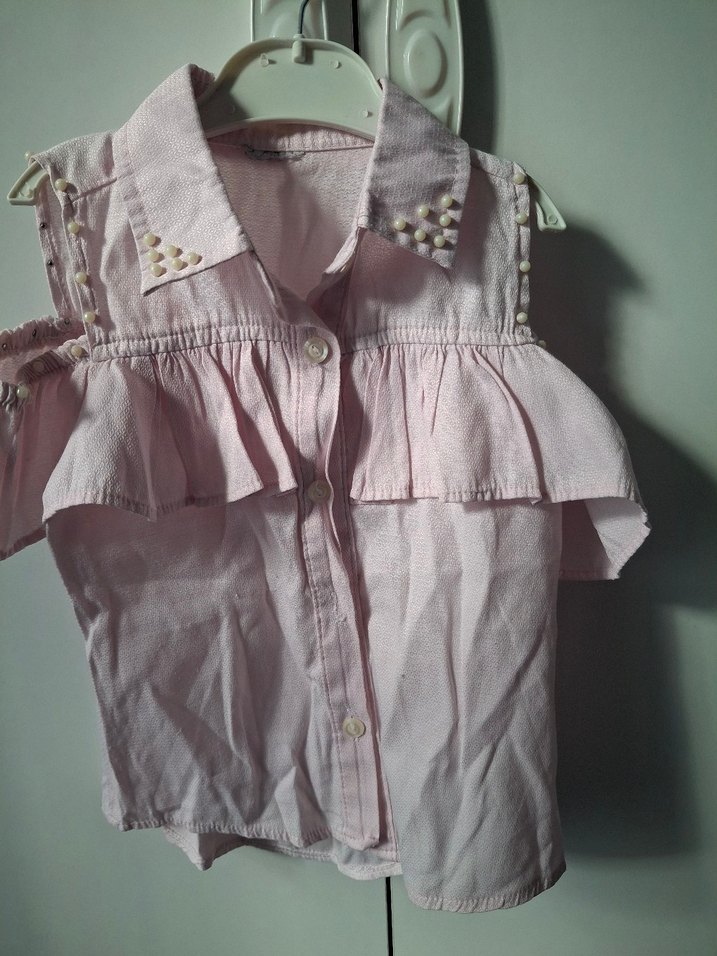Bol kesim, pembe kolsuz bluz, yakalı ve düğmeli, inci detaylıdır. Yumuşak sentetik kumaştan, trend sokak stili için uygundur. ip çekmeleri var ufak ufak uyguna vericem onun için onun dışında temiz güzel
