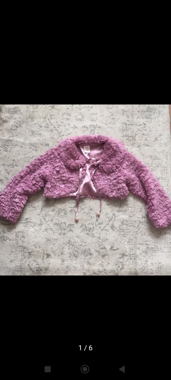 Kız çocukları için uzun kollu, kürk detaylı ve yakalı pembe bolero. Yumuşak, sıcak tutan kumaştan yapılmış, pastel tonlu ve retro tarzda.