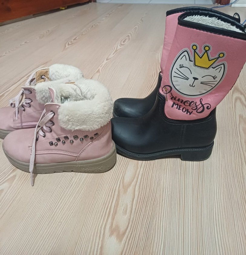 Kürklü detaylara sahip, pastel pembe renkli, baskılı kedili yazılı kız çocuk lastik botları. ikisi de aynı anda satışta ve az kullanılmış