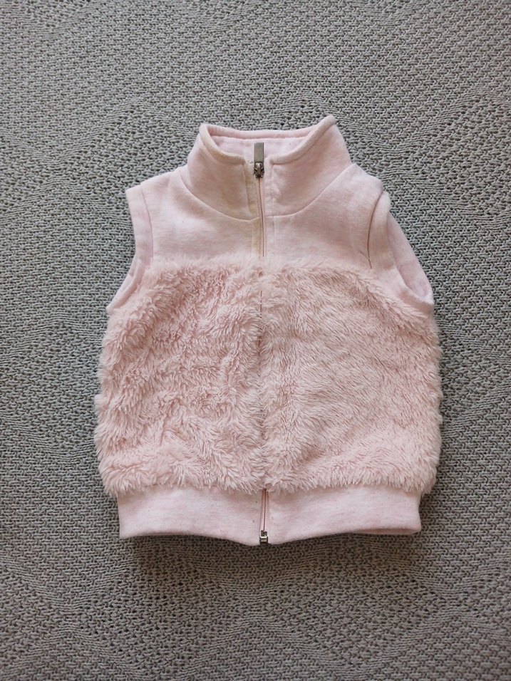 Dik yaka, kolsuz, pembe yumuşak ve sıcak kumaştan yapılmış, ön kısmı kürklü kız çocuk yeleği. Fitted kesim sunar. yaka kısmı lekeli