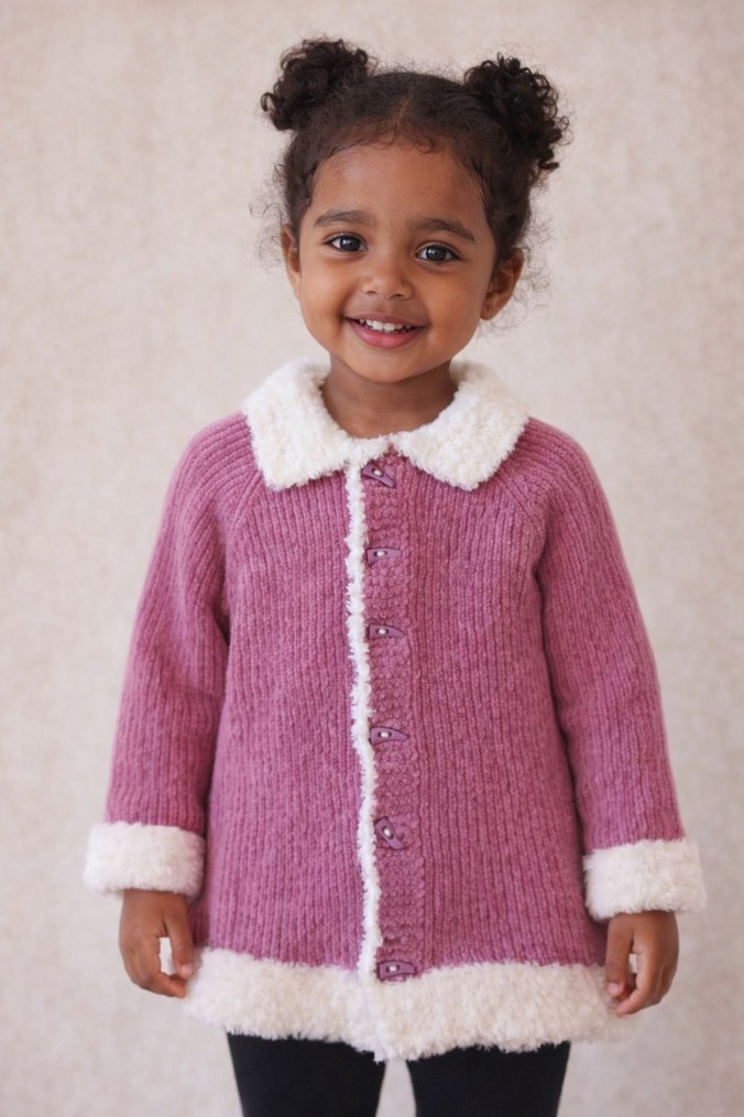 Pembe renkte, uzun kollu ve bol kesim kız çocuk triko hırka. Yaka, manşet ve etek kısmında kürk detayları bulunur, yumuşak ve sıcak bir dokunuş sağlar. Pastel tonlarda sade tasarım.