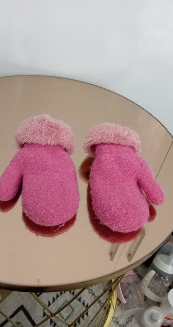 Kız çocukları için pembe, yumuşak ve sıcak kumaştan yapılmış, bilek kısmı kürklü eldivenler.