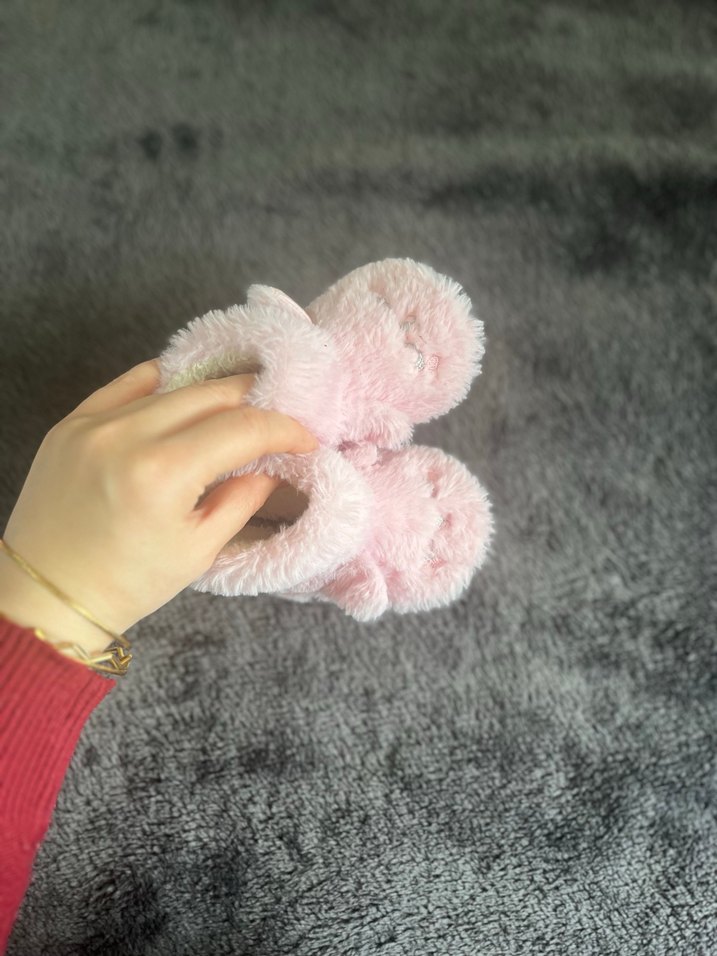 Yumuşak kumaş ve kürklü detaylara sahip pembe kız çocuk ev terliği, nakışlı desenlerle sade ve rahat bir tasarım sunar.