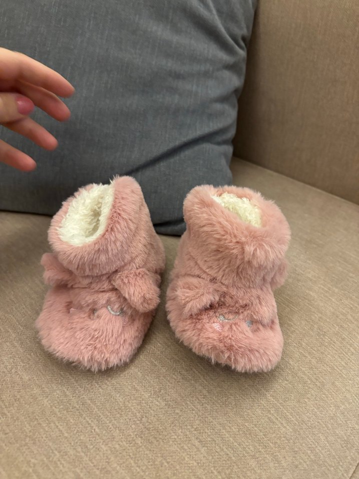 Kız çocukları için yumuşak, peluş kumaştan yapılmış, kürklü ve nakış detaylı pastel pembe ev terlikleri. Rahat ve sade tasarım sunar.
