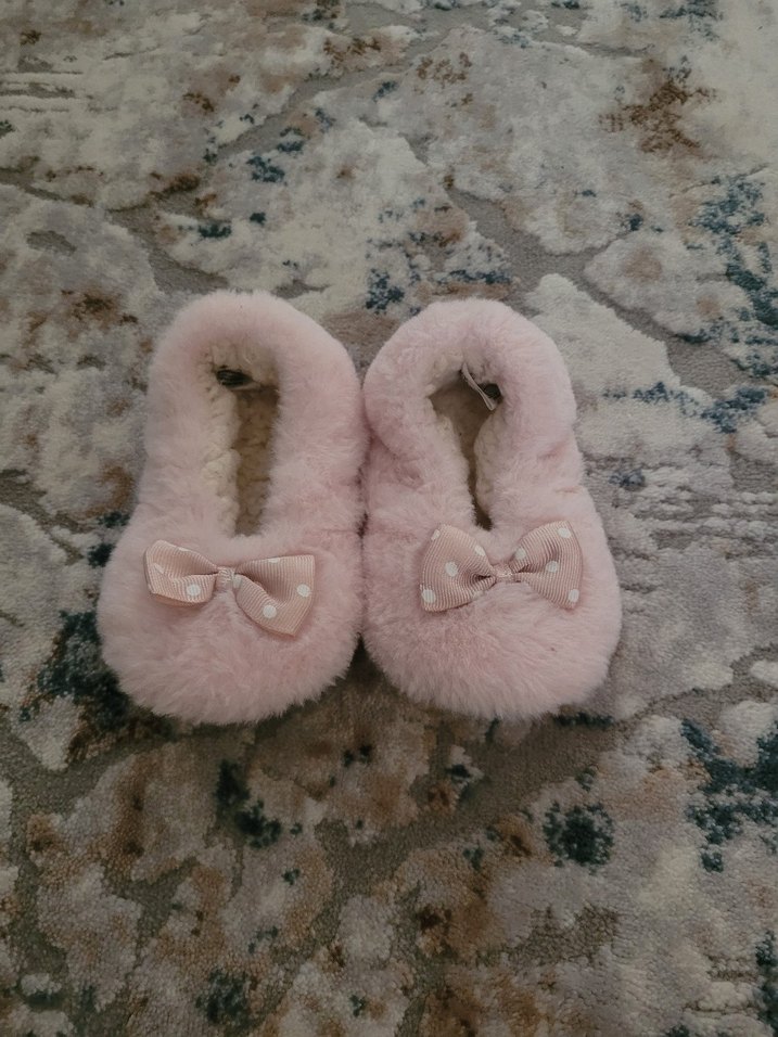 Pembe, yumuşak kürklü detaylara ve fiyonk süslemeye sahip kız çocuk ev terliği, rahat keçe kumaştan üretilmiştir. sıfır 3 yas için.