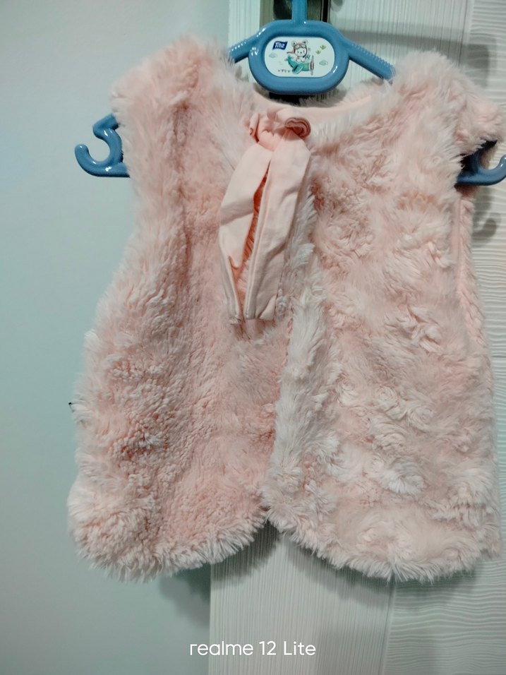 Kız çocuklar için pastel pembe renkte, kürk detaylı, halter yaka ve kolsuz, yumuşak ve sıcak dokulu fitted yelek.