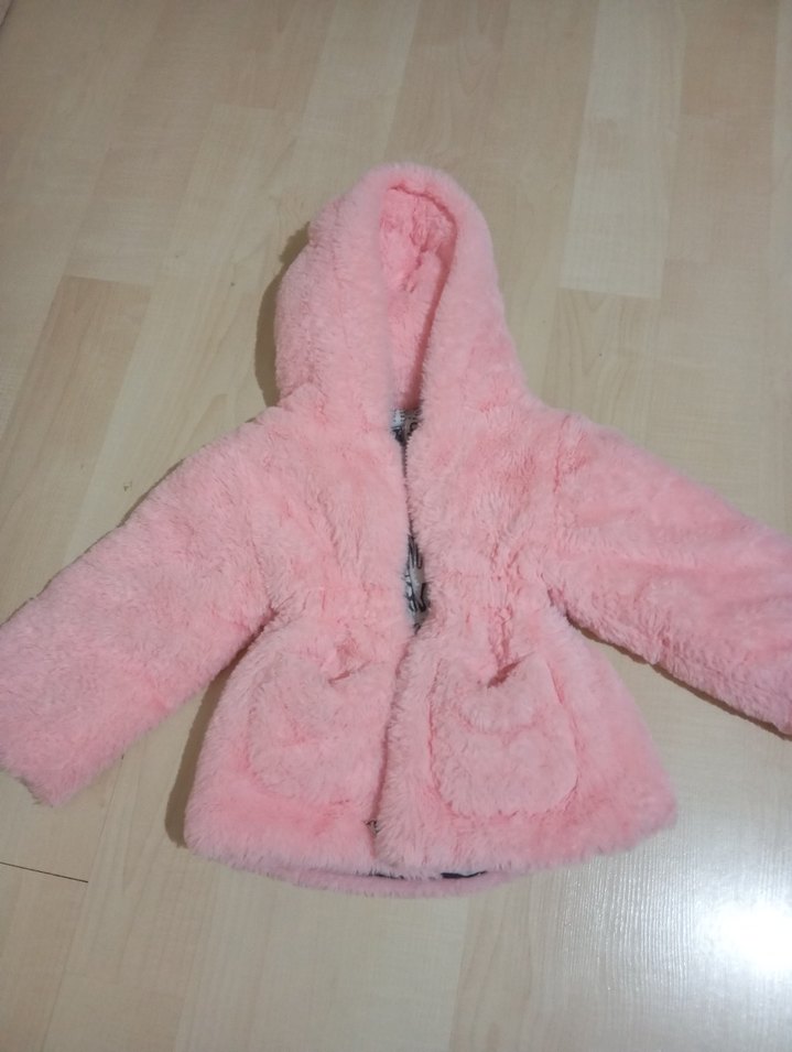 Kız çocukları için pembe, yumuşak ve sıcak kumaştan, kürklü detaylı kapüşonlu, düz ve desen içermeyen, sokak stiline uygun fitted mont.