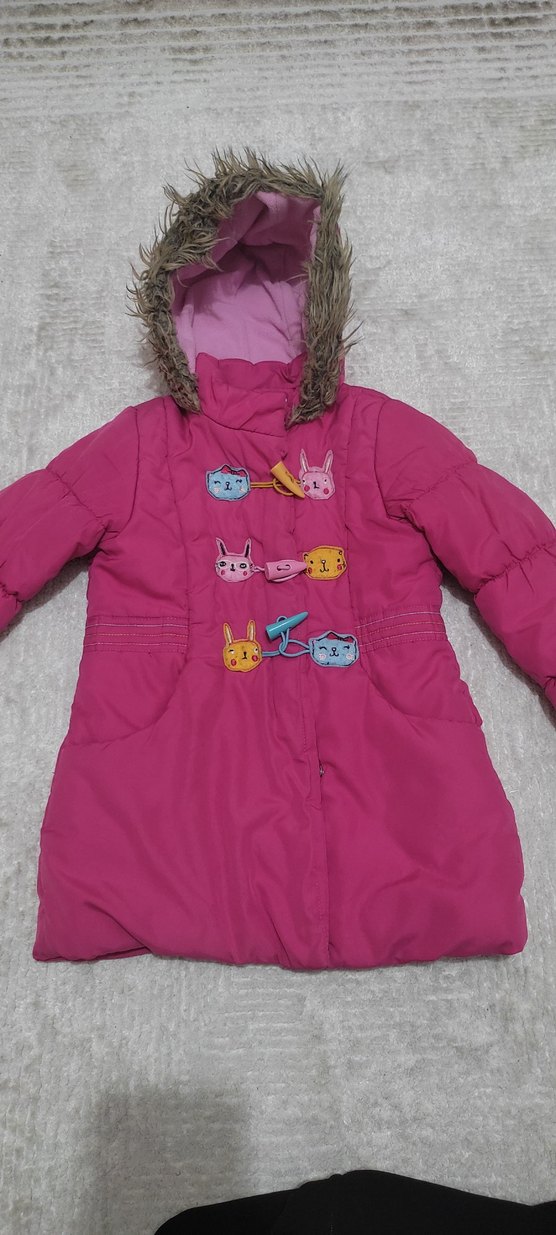 Pembe renk, kürklü kapüşon ve nakışlı renkli hayvan figürleriyle süslenmiş, soft fleece kumaştan yapılmış kız çocuk montu. Şık ve rahat kesimidir.