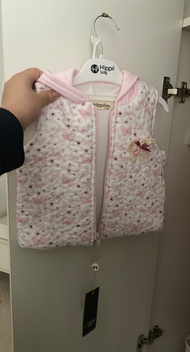 Kız çocukları için fit kesim, kapüşonlu ve kürk detaylı yelek. Pastel pembe renkli, baskılı ve kolsuz tasarıma sahiptir.