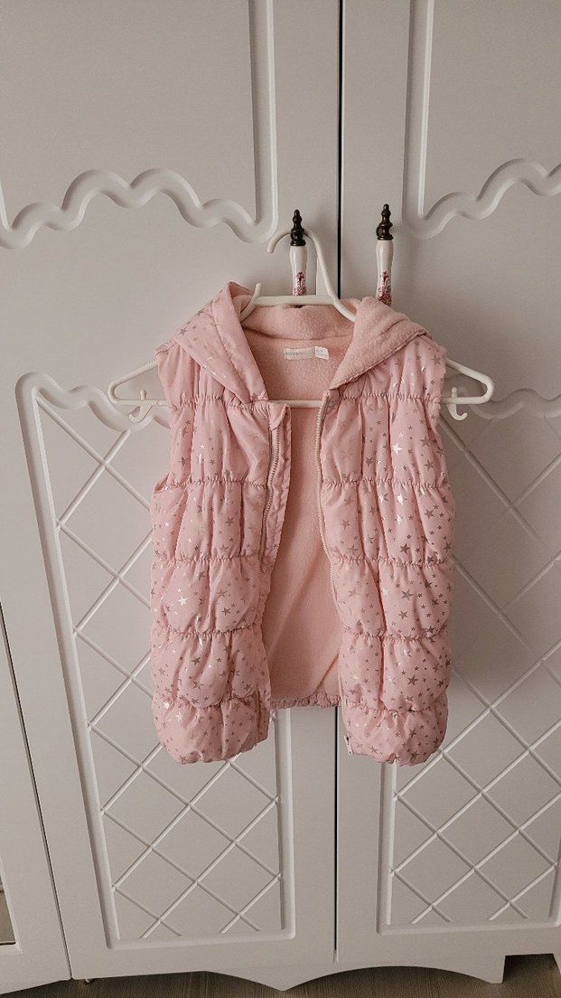 Pembe renkli, kürklü detaylı, kapüşonlu ve kolsuz yelek. İnce kesimi ve yıldız desenleriyle trend sokak giyimine uygun.