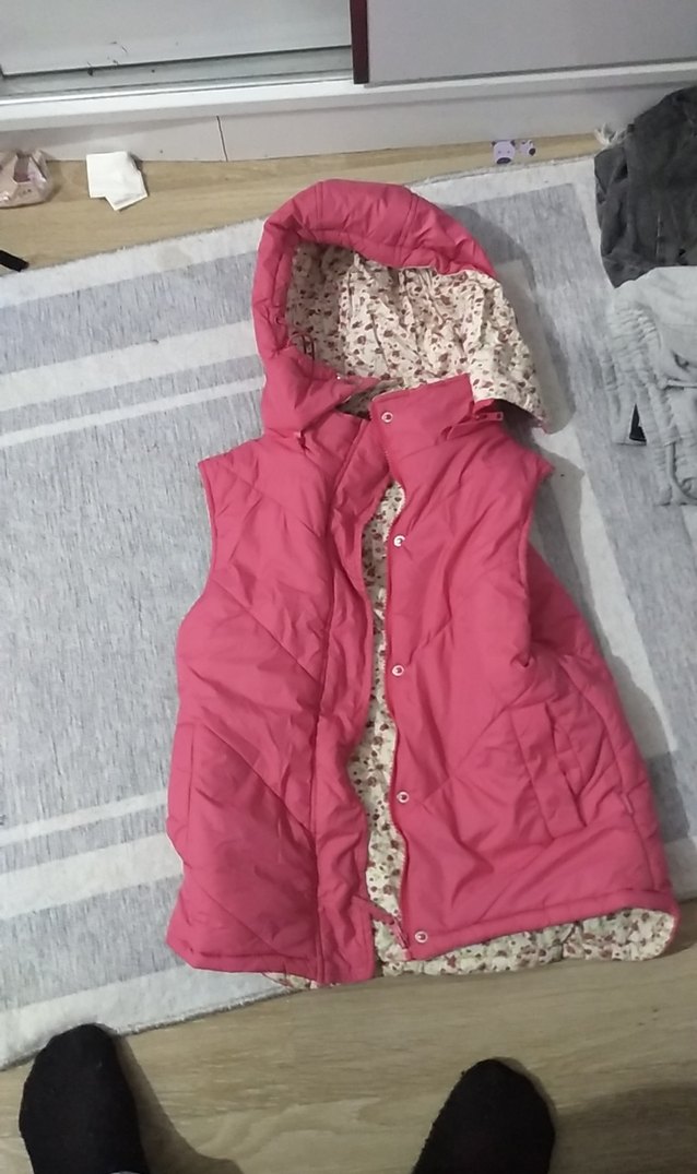 Pembe renkli, kolsuz, straplez yaka kız çocuk yeleği. Kürklü kapüşon ve çiçek desenli yumuşak iç astar içerir. Rahat ve şık sokak tarzı için uygun.