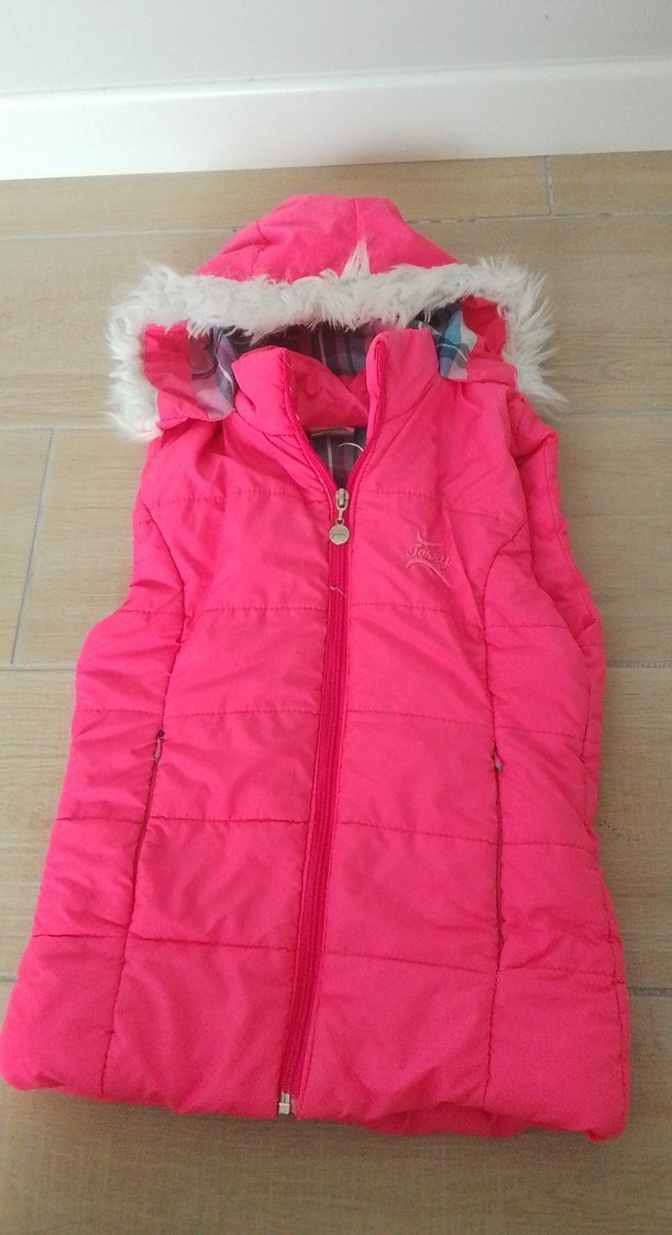 Pembe renkli, kürklü kapüşonlu, kolsuz ve vücuda oturan kız çocuk yeleği. Yumuşak ve sıcak kumaştan üretilmiştir.