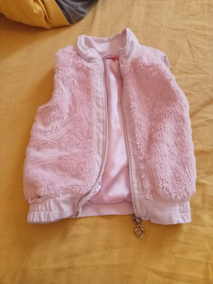 Kız çocukları için pembe, kürk detaylı, kolsuz ve straplez yaka tasarımlı, rahat ve sade kesim yelek.
