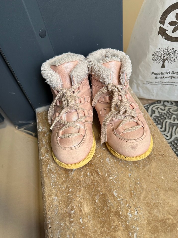 Kız çocuklar için pastel pembe renkte, kürk detaylı lastik bot. Bağcıklı ve soğuk günler için sıcak tutar. ❄️