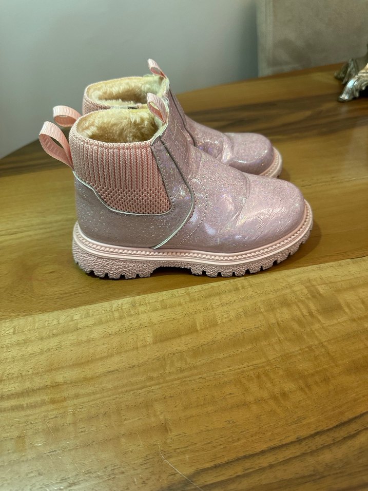 Pastel pembe renkte, kürklü ve lastikli yan detaylı kız çocuk botu. Rahat ve şık sokak stili için uygundur.