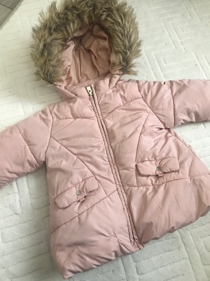 Kız çocukları için pembe, kürklü kapüşonlu ve yumuşak fleece astarlı, fitted kesim mont. Notched lapel yaka ve ön cepler içerir. dikişi var görselde var