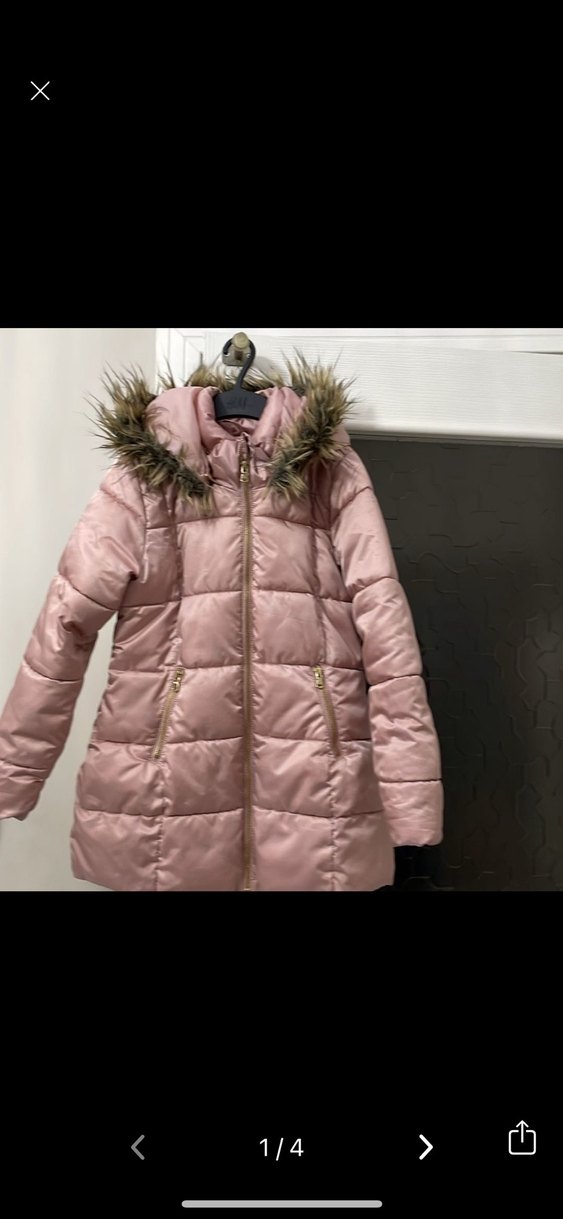 Kız çocukları için pembe, kürklü kapüşonlu ve fermuarlı cepli, pastel tonlarda, dar kesim bir mont. Rahat ve şık sokak stili için uygundur.