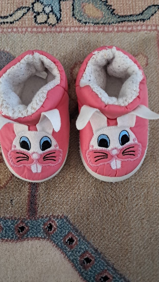 Yumuşak kürklü iç yüzeye ve nakışlı tavşan desenine sahip pembe kız çocuk ev terliği.