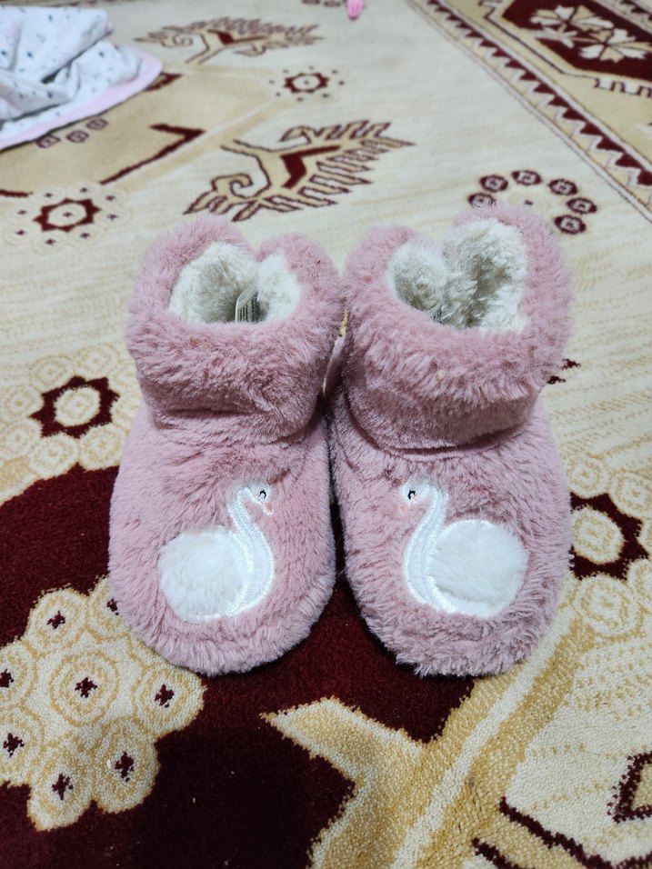 Yumuşak kürklü iç yapısı ve nakışlı kuğu desenli, pembe renkli kız çocuk ev terliği. Pastel tonuyla hoş bir görünüm sunar.