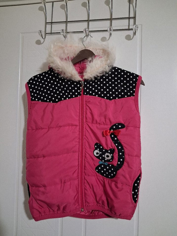 Pembe, kürklü kapüşonlu, nakışlı ve kolsuz kız çocuk yeleği. Streetwear tarzında, renkli ve rahat bir yapıya sahip.