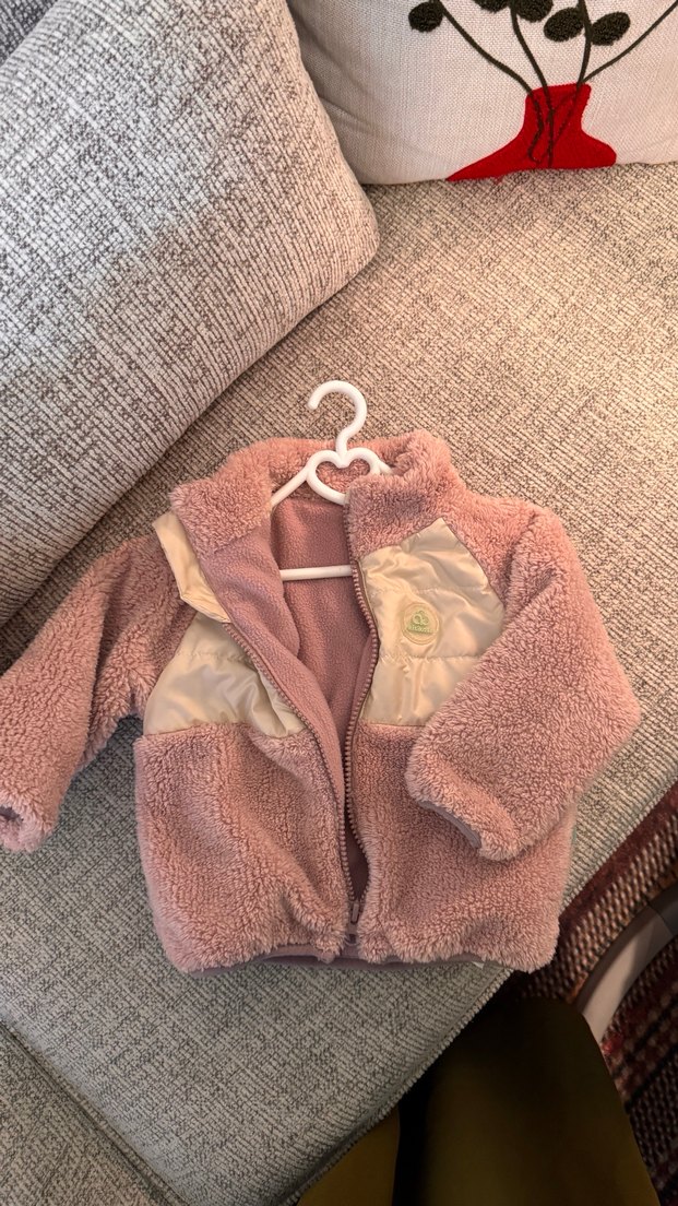 Kız çocuklar için pastel pembe renkli, yumuşak ve sıcak kumaştan, kürk detaylı, rahat kesimli ve kesme yaka özellikli mont.