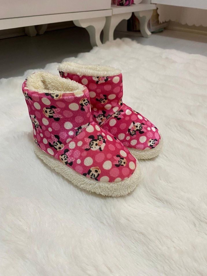 Kız çocukları için renkli pembe bağlama desenli, içi kürklü ve yumuşak sıcak ev botları. Pop kültür tarzıyla eğlenceli görünüme sahip.