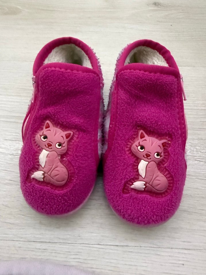 Kız çocuklarına özel pembe renkli, yumuşak kürklü iç astarlı, renkli nakış detaylı sıcak ev terliği. Üst kısmında sevimli kedi figürü bulunur. 24 numara