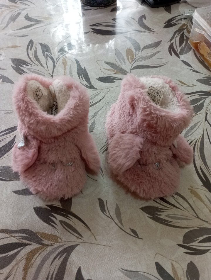 Kız çocukları için tasarlanmış, yumuşak pembe kürklü detaylara ve nakışlı desenlere sahip, sıcak tutan fleece kumaştan ev ayakkabısı