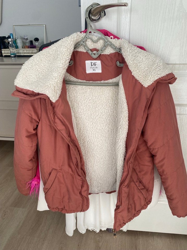 Pembe tonlarında, kürklü detaylara sahip, yumuşak ve sıcak kumaştan yapılmış, kesimi vücuda oturan kız çocuk ceket. Notched lapel yakalı, street wear tarzında.