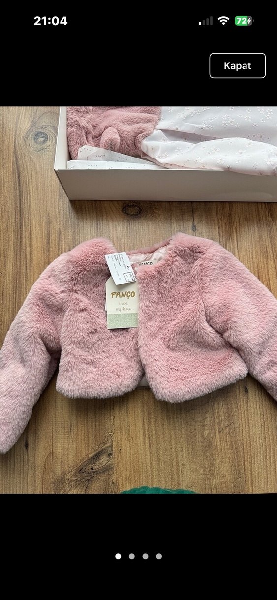 Kız çocuklar için uzun kollu, kürklü detaylı, pastel pembe renkli ve baskılı desenli, yumuşak ve sıcak dokulu fit kesim bolero ve elbise Marka: PANÇO