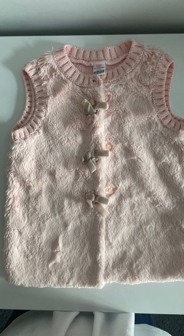Kız çocuk için pastel pembe renkte, kürklü detaylı, askısız, yuvarlak yaka triko yelek. Düğmeli ve fiyonk detaylı, bohem tarzda, vücuda oturan kesim.