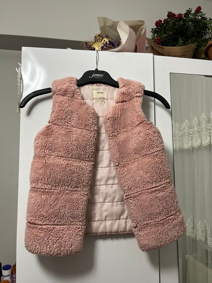 Yumuşak kürk detaylı, bisiklet yaka ve kolsuz pembe yelek. Rahat oturan kesimi ve sade normcore tarzıyla dikkat çeker. Az kullanıldı defosu yoktur 4-5 yaştır.