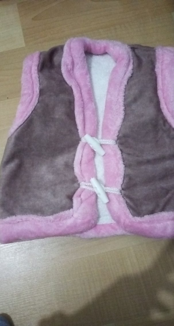 V yaka ve kolsuz tasarıma sahip, yumuşak ve sıcak kumaştan yapılmış, pembe kürklü detaylı, pastel tonlarda kız çocuk yeleği. hiçbir sıkıntısı yok tertemiz