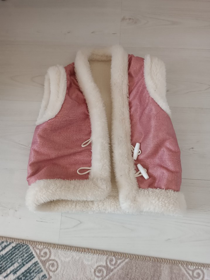 Bu kız çocuk yeleği, kenarlarında kürk detaylarıyla yumuşak ve sıcak bir kumaşa sahiptir. Kolsuz ve askısız yakalıdır, pastel pembe renktedir ve sokak modası tarzındadır.