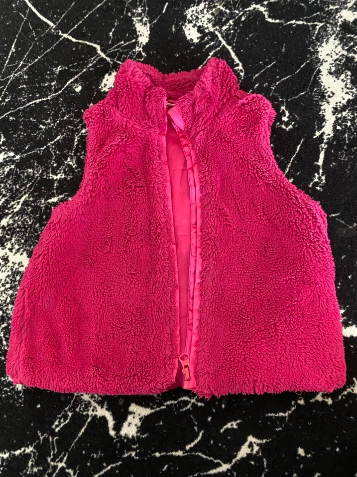 Yumuşak ve sıcak kumaştan yapılmış, kürklü detaylara sahip pembe renkli kız çocuk yeleği. Kolsuz ve yüksek yakalı, vücuda oturan kesimde.