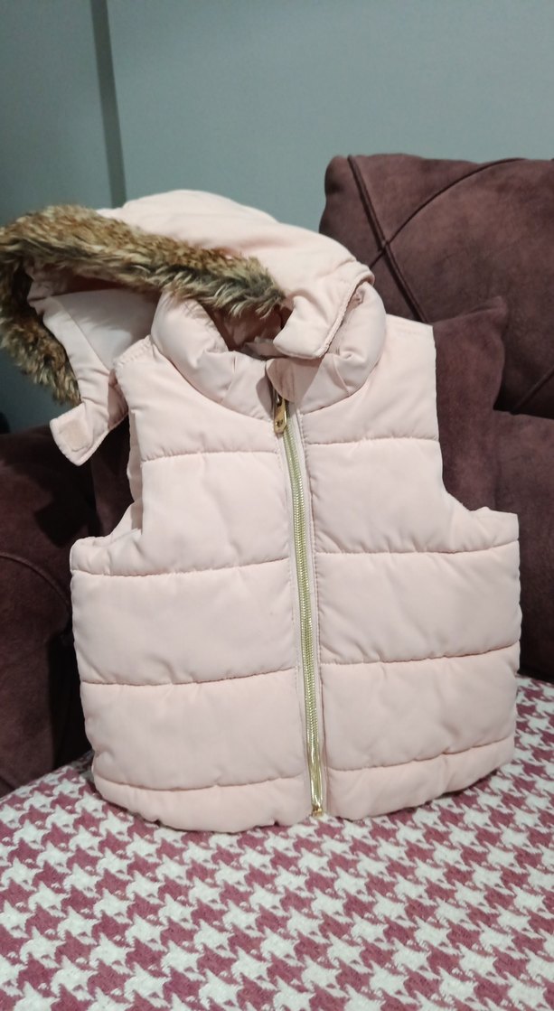 Pastel pembe renkli, kürklü kapüşonlu kız çocuk yeleği, kolsuz ve ince kesimdir, yumuşak ve sıcak kumaştan üretilmiştir.