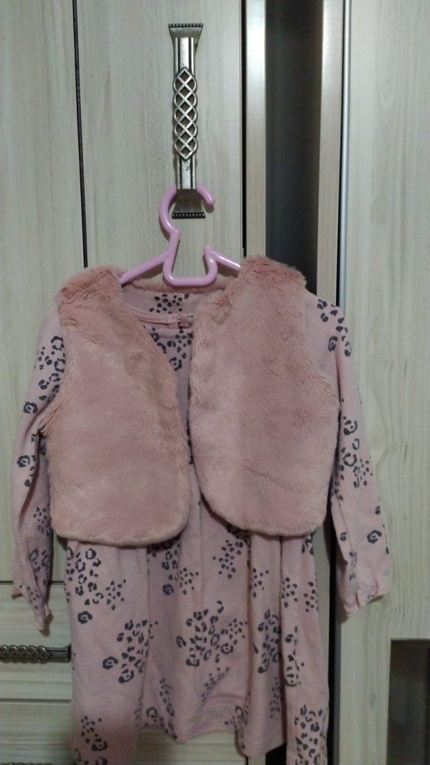 Pembe pastel renkte, kürk detaylı ve kolsuz, dar kesim kız çocuk yeleği ve Elbisesi. Esnek, pamuklu ve rahattır. 1 kez giyildi.