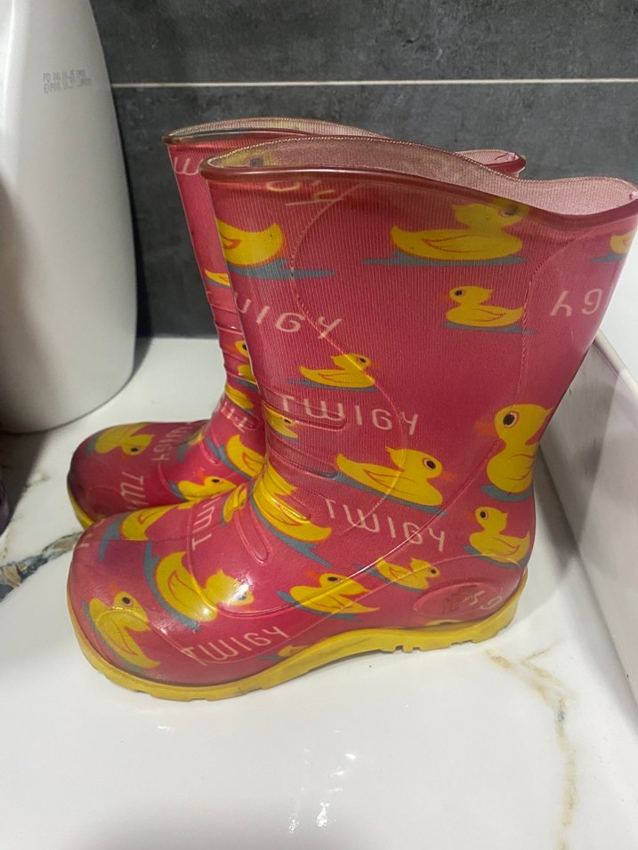 Kız çocukları için pembe lastik çizme, sarı ördek desenli ve tokalı tasarıma sahip, renkli ve eğlenceli bir modeldir. 26 27 numaradır