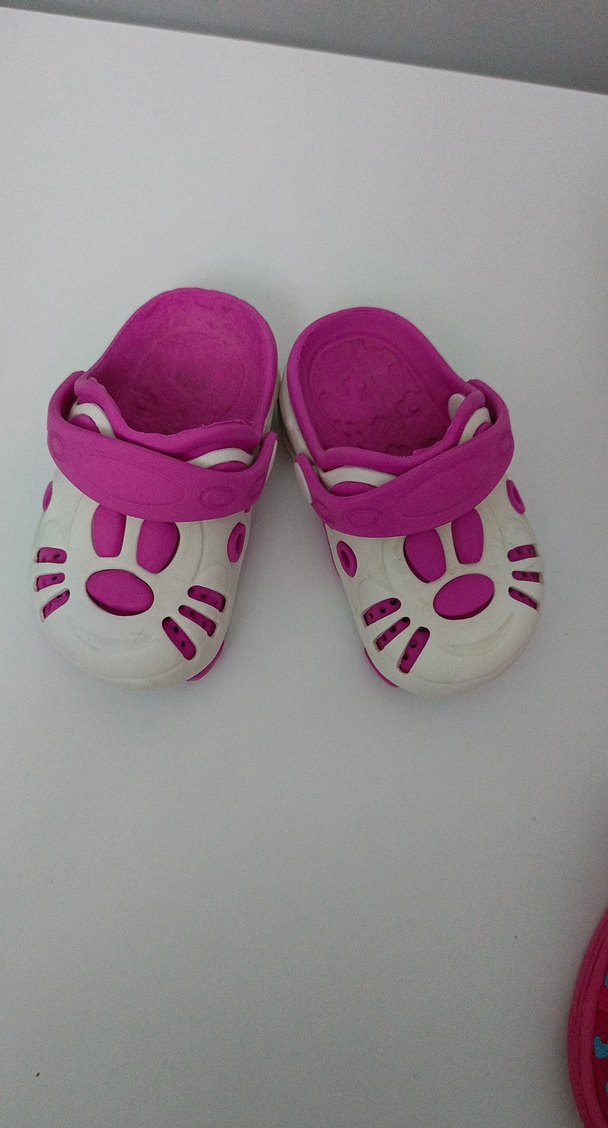 Pembe kız çocuk terliği, renkli leopar desenleri ve ayarlanabilir cırt cırtlı bant içerir. Kauçuk malzemeden üretilmiş olup rahat ve güvenli kullanım sağlar.