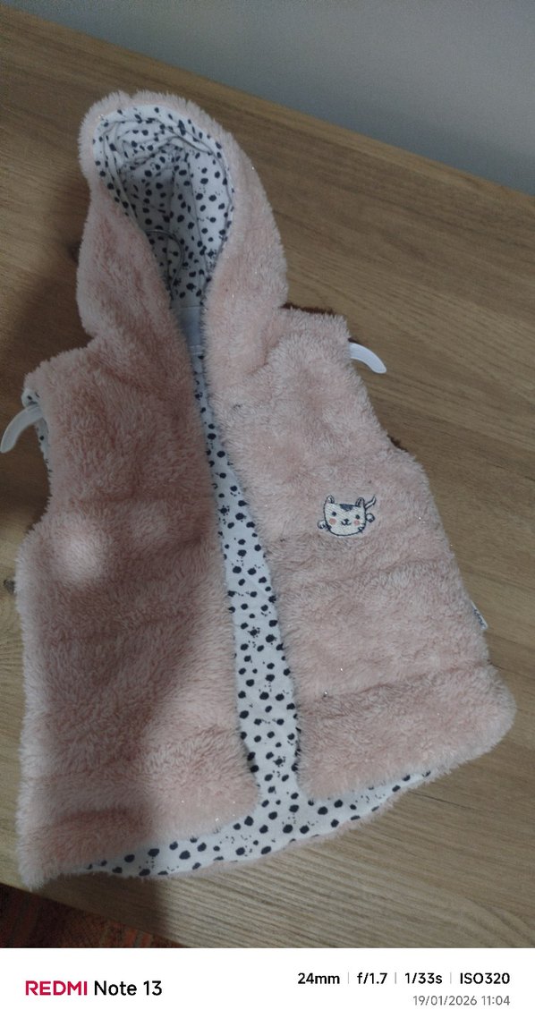 Kolları olmayan, yumuşak peluş kumaştan yapılmış pembe yelek, leopar desenli astar ve küçük kedi detayıyla dikkat çekiyor.